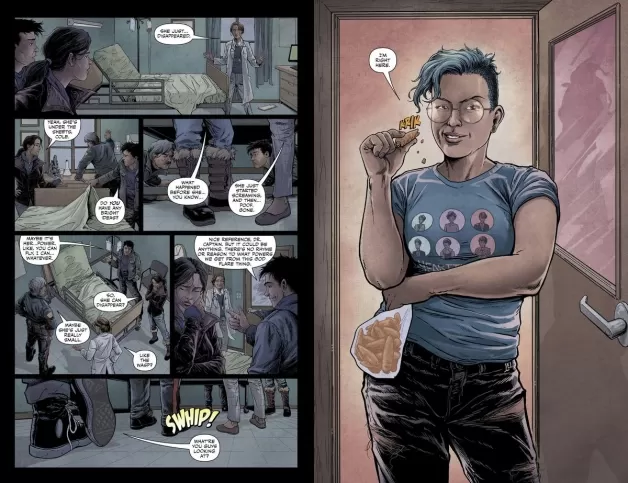 The art style is realistic and gritty, reflecting the serious and dystopian tone of the story. Colors are dark and muted, actions are clear, and special effects of the supernatural pop off the page, a marked contrast to more normal backgrounds and objects.” — Youth Services Book Review