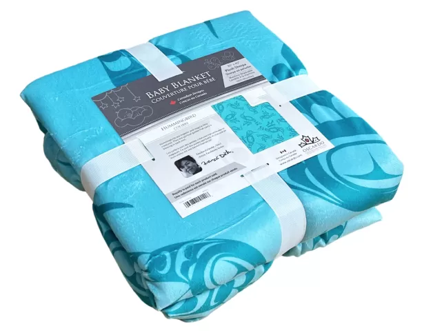 This baby blanket features Kwakwaka’wakw artist Francis Dick's Hummingbird design.