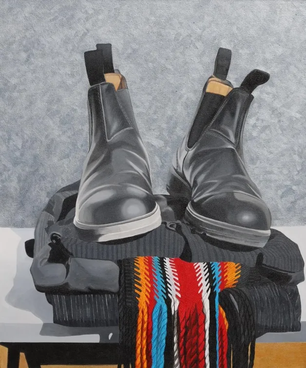 A nod to the Reports of Truth and Reconciliation Commission, in which Justice Murray Sinclair describes the residential school system as “one of the darkest, most troubling chapters in our nation’s history,” Garneau’s still life paintings combine common objects (books, bones, teacups, mirrors) and less familiar ones (a Métis sash, a stone hammer, a braid of sweetgrass) to reflect the complexity of contemporary Indigenous experiences. Provocative titles like “Métis in the Academy” and “Smudge Before Reading” invite consideration of the mixed influences and loyalties faced by Indigenous students and scholars. Other paintings explore colonialism, vertical and lateral violence, Christian influence on traditional knowledge, and museum treatment of Indigenous belongings.
