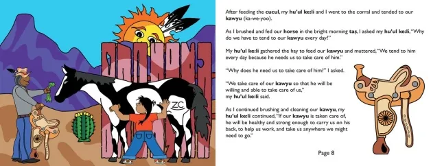 How a young boy is raised by his grandfather on the Tohono O'odham Indian Reservation. The book denotes various aspects of O'odham himdag (culture) and begins with a simple question that the boy asks his Hu'ul Ke:li (Grandfather) with a culturally relevant answer as to why they do the things they do during the day. Various activities include waking up early in the morning and asking why they do so - to daily chores and activities such as tending horses, working in the garden, hauling water, and gathering food/medicine in the desert.