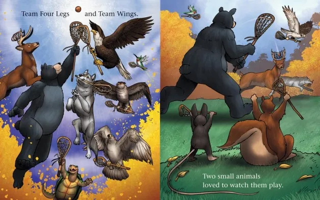 A game of lacrosse is about to begin—with the four-legged animals facing off against the winged animals. Mouse and Squirrel want to join!