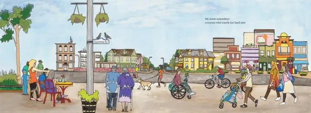 In lyrical text, the street remembers agreements to live in peace, the efforts of the British to take the land with unfair treaties, and the conflict and suffering that followed. The street recalls its naming, paving and the waves of immigrants who called it home. Illustrations of recent times depict Canada's apology to Indigenous Peoples and efforts toward Truth and Reconciliation, including a march with a banner that reads: Every Child Matters.