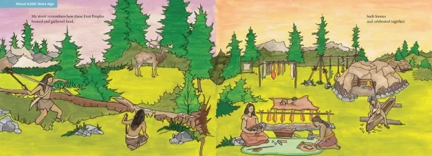 The story begins 14,000 years ago, when mammoths roamed the icefields, and the First Peoples followed their trail. Historically accurate illustrations show the lives of their descendants over thousands of years as they hunted and gathered food, built homes and celebrated together, until the 1600s, when Europeans arrived with settlers in their wake.