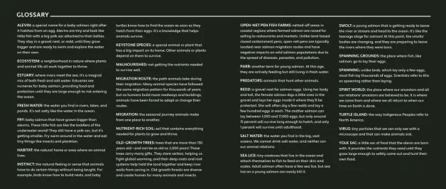 As the young salmon journey from their gravel nests to the open ocean, readers learn about the life cycle of wild salmon, the effects of open-net pen fish farms, and the role of salmon as a keystone species.