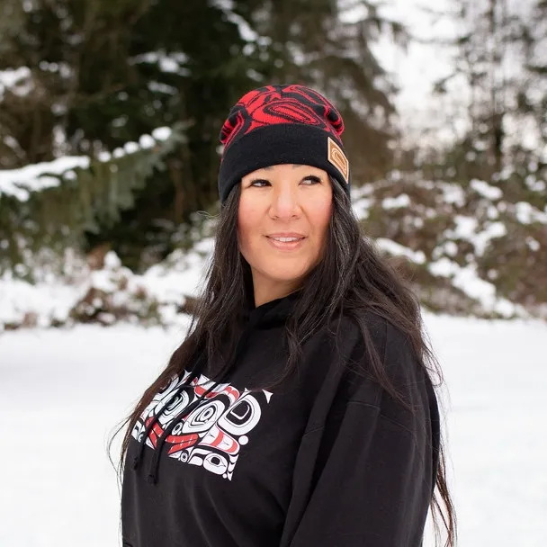 Toque, Tuque, Ski Cap, Beanie - whatever name you use, reach for this versatile and warm knitted hat with embroidered Indigenous artwork to make your outdoor adventures warm and cozy this season.