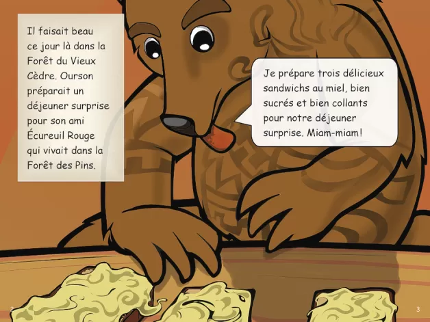 Niveau 17 Présentation du livre de couverture: Ourson décide d’aller rendre visite à Écureuil Rouge qui habite dans la Forêt des Pins. Il prépare un déjeuner délicieux mais un des sandwichs qu’il a fait disparaît. À votre avis, comment un sandwich peut-il disparaître ?