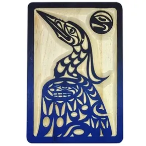 This pine wood plaque features Coast Salish artist Joe Wilson's Blue Heron design.